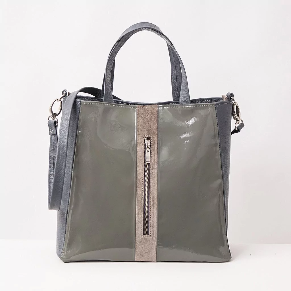 Cartera combinada en cuero charol, graneado y gamuzado. Frente con bolsillo vertical. Cerramiento superior con cierre metal al tono. Correa corta para llevar en antebrazo; y correa larga desmontable con mosquetones. Interior forrado en gross con doble bolsillo, uno con cierre y el otro portacelular. Herrajes plateados. Medidas: alto 32 cm, ancho 32 cm , base 12 cm